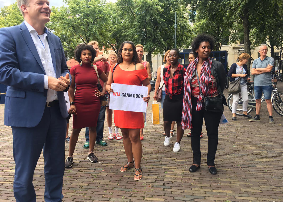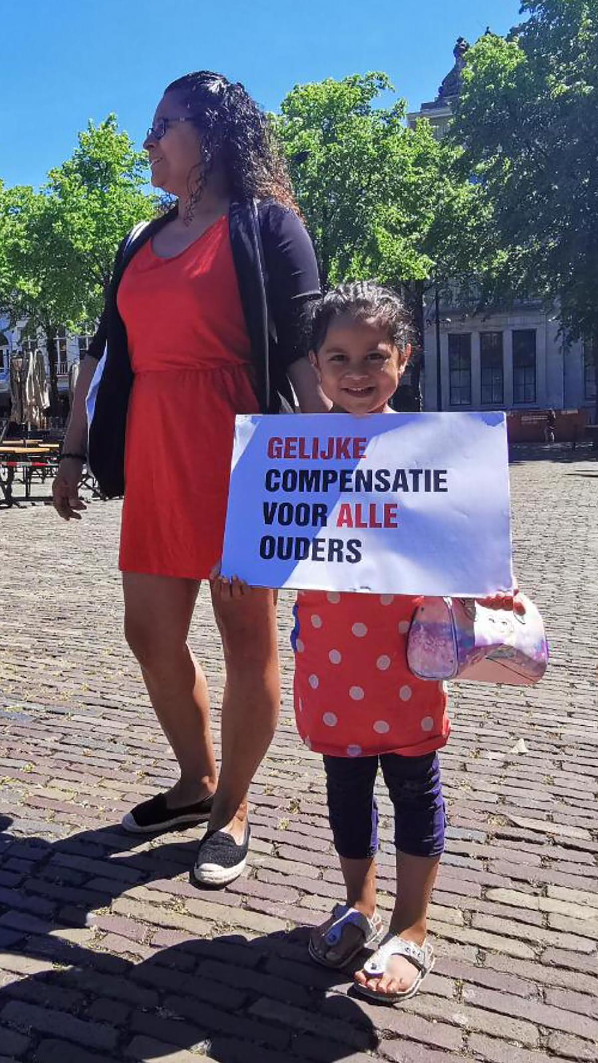 Angélica Engels met gedupeerde ouders van de toeslagenaffaire bij een demonstratie in Den Haag, juni 2020.