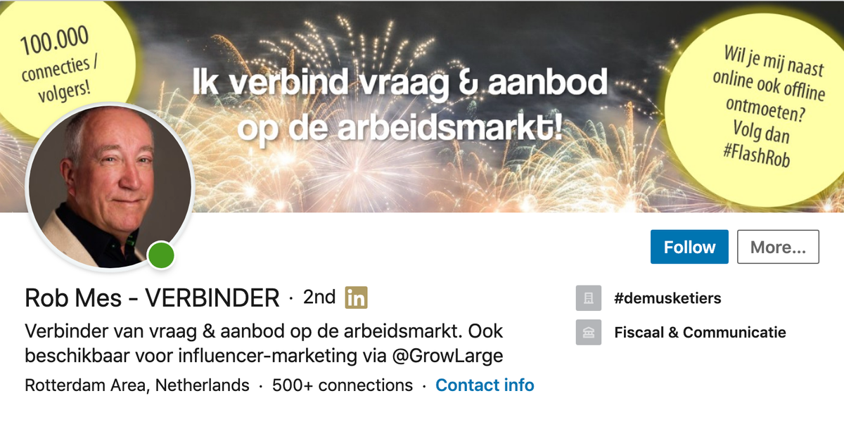 Toen Rob Mes met pensioen ging, had hij geen zin om achter de geraniums te gaan zitten. Omdat hij een groot netwerk had, vroeg een kennis hem of hij werk kon regelen voor diens zoon en inmiddels vult hij daar zijn tijd mee. Via zijn LinkedIn pagina verbindt Mes werkzoekenden aan werkgevers. Als mensen hem (gratis) volgen deelt hij hun posts op zijn pagina en helpt zo duizenden mensen aan een baan.