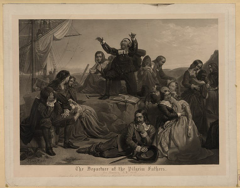 Prent genaamd: 'Het vertrek van de 'pilgrim fathers' naar Amerika, 1620'. Deze pelgrims ontvluchtten Groot-Brittannie vanwege hun puriteinse geloof en kwamen daarvoor in Amsterdam en Leiden terecht. Ook daar konden ze niet aarden, waarna ze besloten in de roaring twenties van de 17de eeuw met de Mayflower naar de Nieuwe Wereld te varen. In de huidige staat staat Massachusetts, in het noordoosten van de VS kwamen ze aan land in 1620 en stichtten daar een kolonie. De legende gaat dat deze Pilgrim Fathers de eerste Thanksgiving vierden samen met de inheemse bevolking. Volgens genealogisch onderzoek stammen negen Amerikaanse presidenten af van deze Pilgrims: Barack Obama, George Bush senior en junior, John Adams, John Quincy Adams, Ulysses Grant, Calvin Coolidge, Zachary Taylor en Franklin Delano Roosevelt.