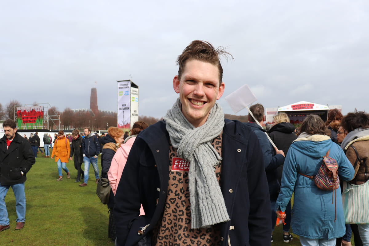 'Ik ben een zij-instromer sinds een aantal weken. Dus ik sta nu ook voor de klas op een basisschool. En ik ben hier eigenlijk niet per se om ergens voor te strijden, maar vooral uit interesse. Als zij-instromer is het namelijk allemaal wél vrij goed geregeld. Ik ben dus vooral geïnteresseerd om te zien hoe zo’n staking gaat. Want er gaan er nog meer komen.'