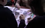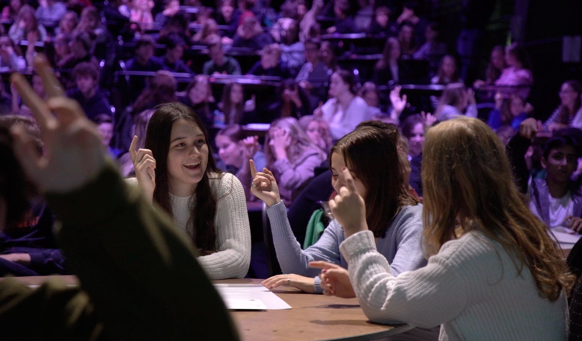 Dan is het tijd voor de stellingen die we de leerlingen voorleggen. Als je het eens bent met een stelling, mag je opstaan, als je het niet eens bent, mag je blijven zitten. 'Zijn sociale media een betrouwbare nieuwsbron?' wordt aan de leerlingen voorgelegd. Het valt op hoeveel leerlingen gaan staan.