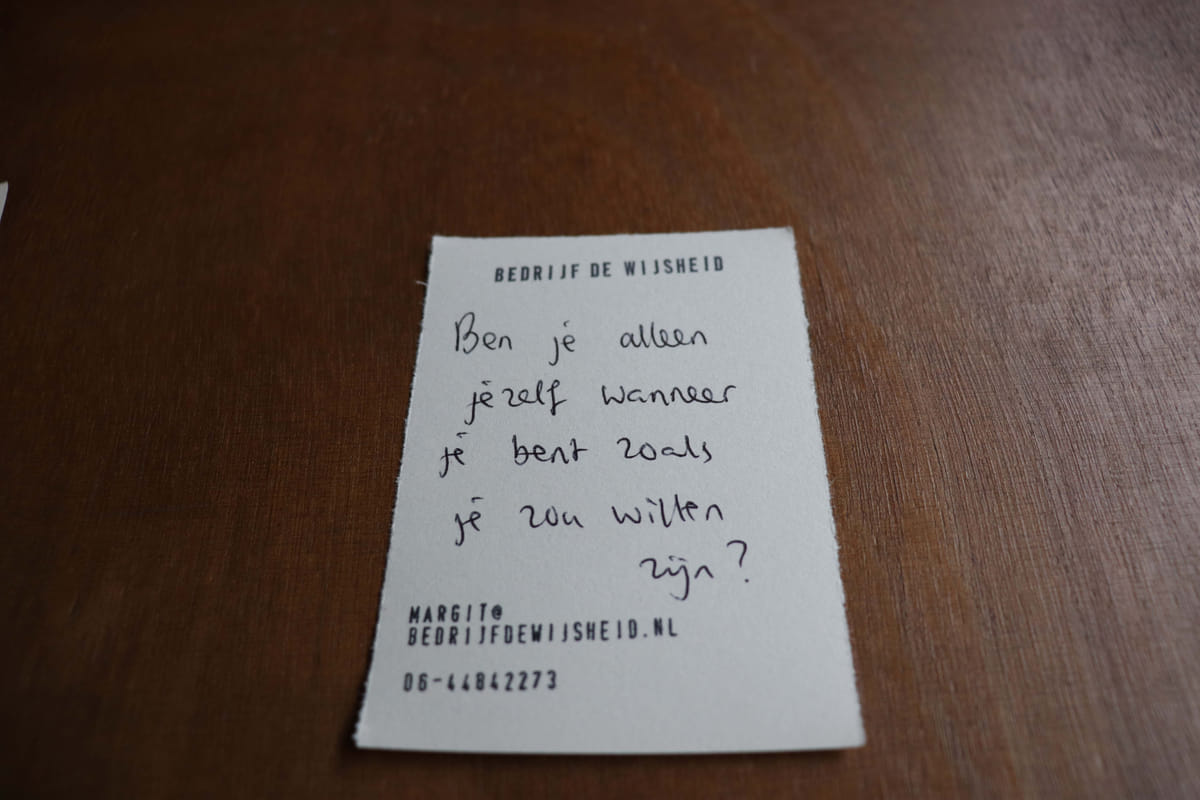 Margit schrijft de vraag op een briefje. Een ‘vraag op recept’. Het is gek, deze vraag ‘klopt’. Ik zou deze vraag nooit zelf bedenken. Het is nou niet bepaald een shower thought, maar ik voel wel de urgentie om deze vraag verder te onderzoeken.