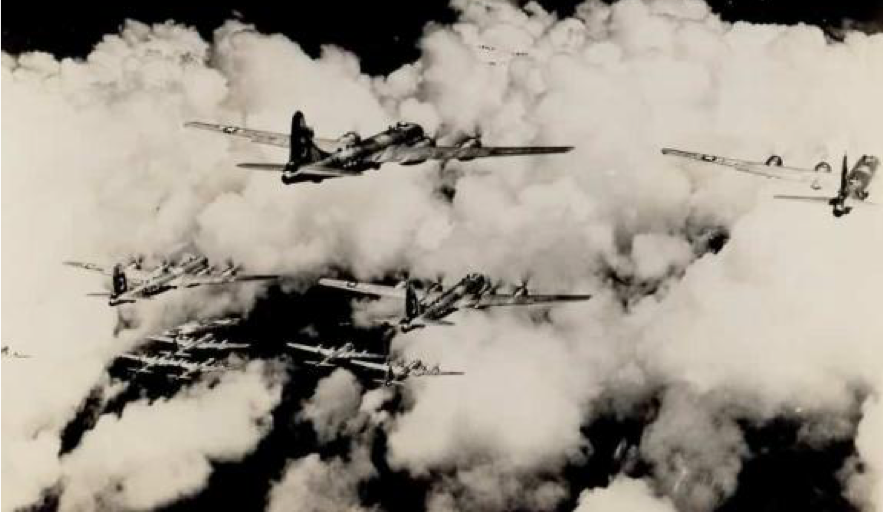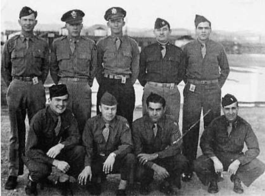 Geknield van links naar rechts: Sgt. Jack Bivans, asst. Ingenieur; SGT. Gillen Nicely – Tail gunner; Sgt. Pasquale Baldasaro – Radio-operator; Lt. Eugene Grennan – Fight engeneer;