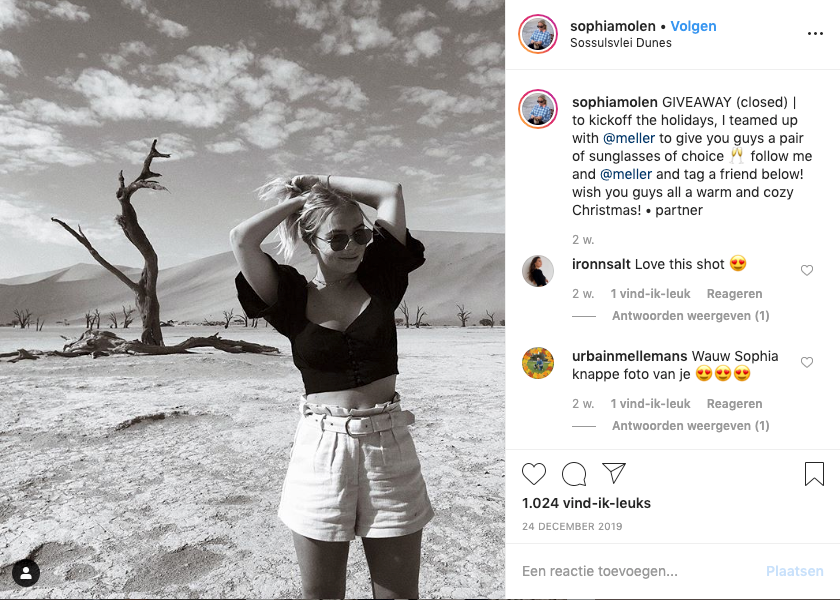 Sowieso denkt ze dat het voor haar werk niet uit zal maken. Als influencer verdient ze geld doordat merken haar voor haar foto’s betalen. Voor zo’n merk is het belangrijk dat een foto veel mensen bereikt. Daarvoor kijken ze volgens Molen niet vaak naar het aantal likes, maar naar andere graadmeters, zoals het aantal volgers. Als het aantal likes niet te zien is, maar de rest van haar bereik hoog genoeg is, zullen merken nog steeds met haar in zee gaan.