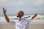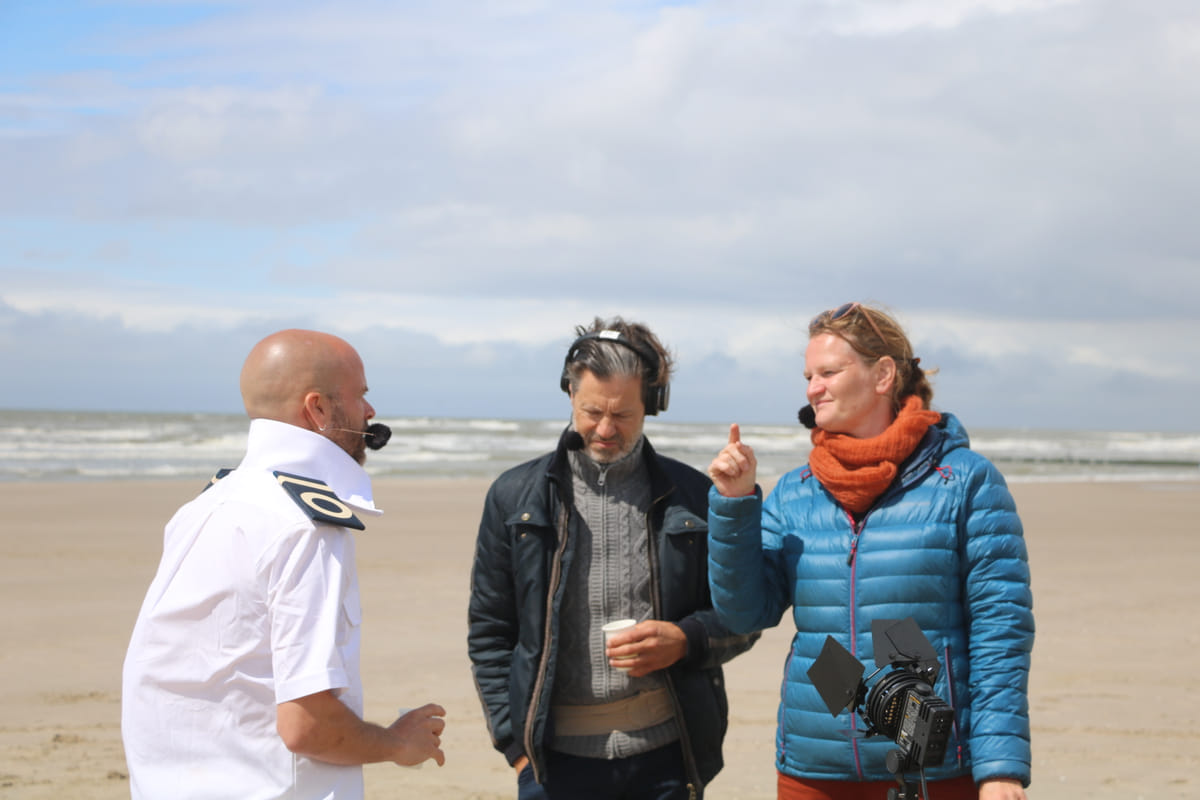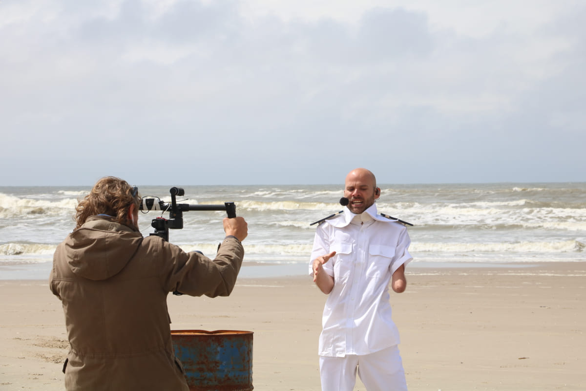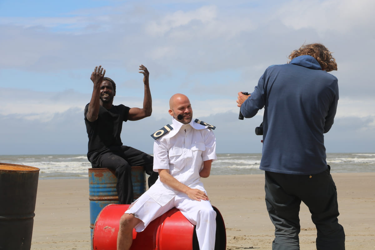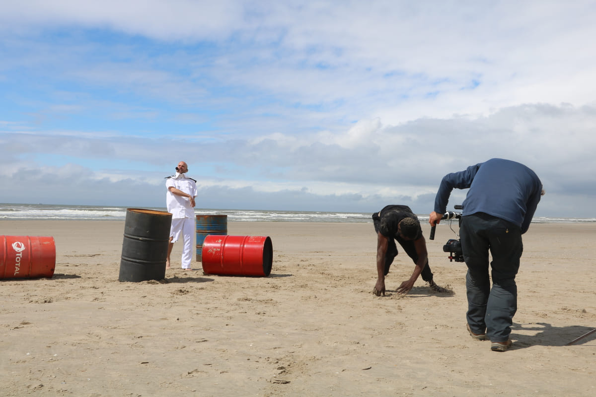 Het licht weerkaatst op een wit kapiteinskostuum, gedragen door een man die op blote voeten tussen de olievaten stapt. Hij spreekt op rappende toon en kijkt direct in de camera richting de kijker. "Dat is Guus," zegt regisseur Gienke Deuten. "Hij speelt de aangespoelde kapitein." Af en toe klinkt een schelle krijs van zeemeeuwen die overvliegen. Ze kijken niet op of om naar wat er zich allemaal afspeelt op het strand. Al pootjebadend lopen de vogels onverstoord door de vloedlijn heen.