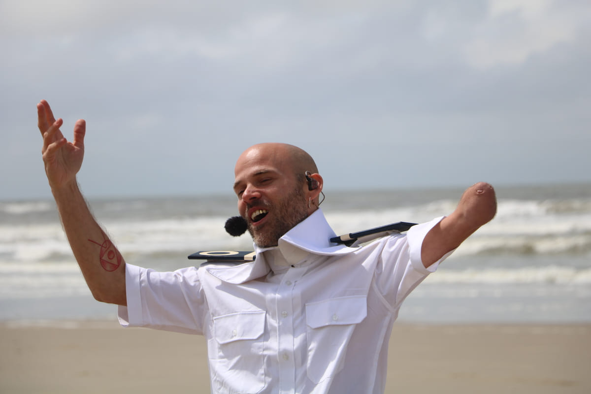 "Het is de bedoeling om zo dicht mogelijk bij de zee te zijn, om het gevoel te geven dat de zee en haar geluid een medespeler wordt binnen de hele voorstelling," vertelt Romain.