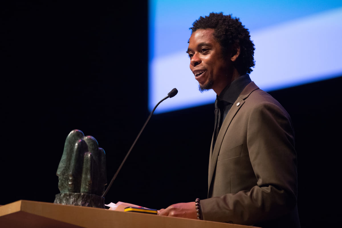 Glenn de Randamie speechte zelf over hoe hij bruggen wil bouwen en ons land een positieve injectie wil geven. Maar ook over zijn voornemen om voortaan niet meer naar het nieuws te kijken, maar naar de processen die daaronder liggen en daar van te leren, ‘want de geschiedenis blijft zich herhalen’. Hij liet weten hoe móe hij is, van de media, van zichzelf, van alle ‘shit’ die hij over zich heen heeft gekregen de afgelopen jaren. ‘Het is niet niets om je nek uit te steken’, voegde hij daar aan toe. Maar hij voelt zich ook gedragen door de mensen om hem heen en dankt het Humanistisch Verbond voor de erkenning in deze prijs. ‘Ik vind het bijzonder om als hiphop schoffie op zo’n podium deze prijs in ontvangst te nemen’.