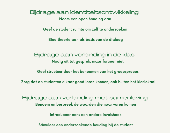 Tijdens het onderzoek verzamelde Florien verschillende inzichten die docenten houvast kunnen bieden om bij te dragen aan burgerschapsvorming tijdens een klassikale dialoog. Zo is het benoemen van de processen in het klassikale gesprek belangrijk om structuur aan te brengen. De docent neemt de studenten mee in wat er tijdens het gesprek gebeurt. Bijvoorbeeld door inzicht te geven in welke meningen met elkaar botsen. Daarnaast kunnen docenten waarden als vrijheid en gelijkheid ter sprake brengen en kunnen zij bijdragen door het stimuleren van een onderzoekende houding van de studenten. Bijvoorbeeld door de student uit te dagen om verder te denken met een vraag als 'Wat gaat er in je om?'. De docent leert geen gedrag aan maar maakt studenten enthousiast om zich bezig te houden met maatschappelijke thema’s.