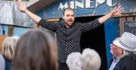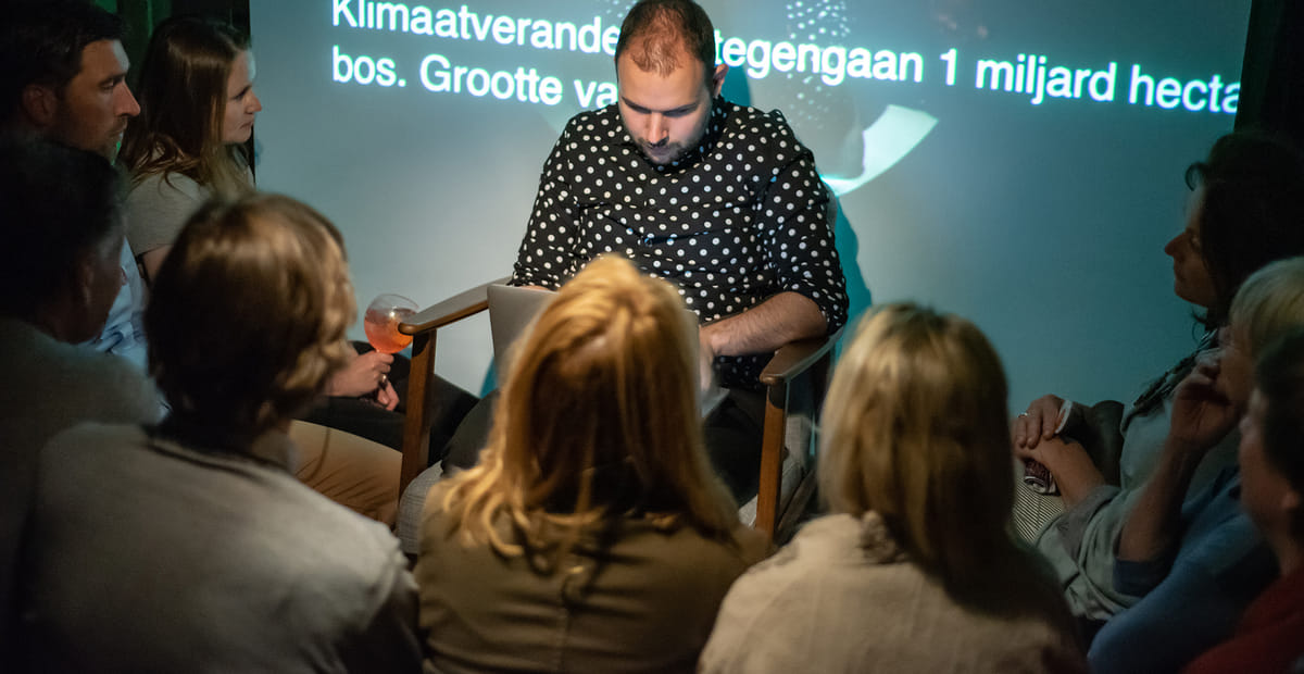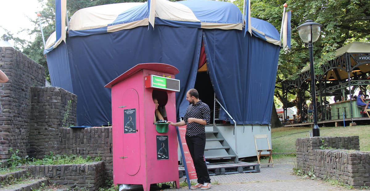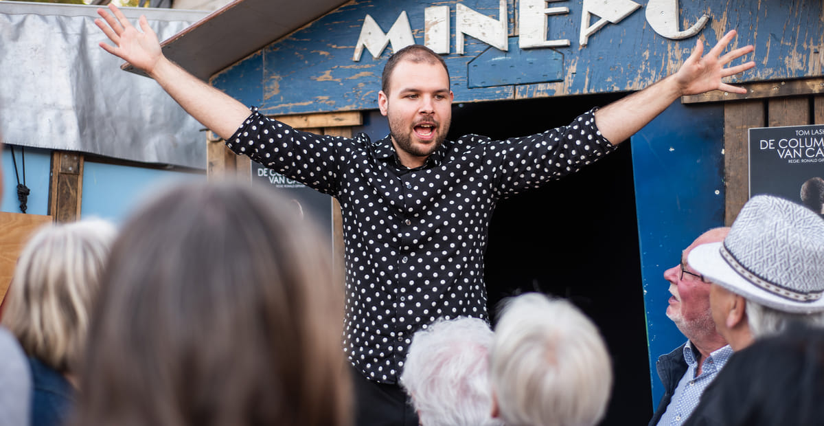 Een uur voor aanvang van de voorstelling staat Tom Lash voor ‘zijn’ tent op de Parade. ‘Zijn jullie mensen met een mening,’ vraagt hij voorbijgangers, al parade makend. ‘Ik ga namelijk zo een column schrijven op basis van jullie meningen. Komen jullie helpen?’