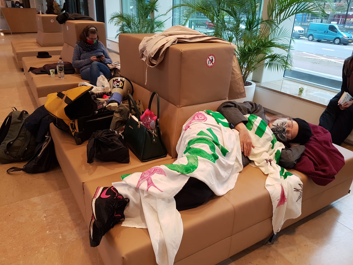 Aangezien aan deze eis niet voldaan kan worden, besluit de groep dat ze het gebouw blijven bezetten. Na een uurtje of twee lijkt de adrenaline van de actie weggeëbt. Tussendoor vragen een beveiliger van het pand en een agent of ze het spandoek even opnieuw willen uitklappen, zodat zij er een foto van kunnen maken, voor thuis of voor Insta, het gebeurt natuurlijk niet dagelijks dat je lobby wordt bezet door klimaatactivisten.