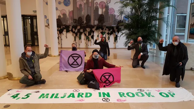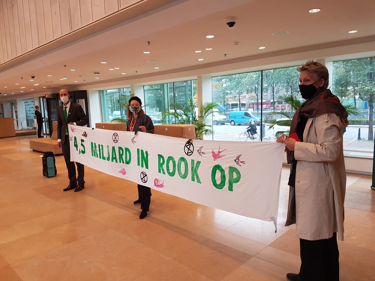 Terwijl Lucas een persbericht laat uitgaan over de volgende actie van Extincion Rebellion, halen twee andere 'rebellen' uit hun rugzak een meterslang spandoek met daarop de tekst: ‘4,5 miljard in rook op’. De beveiliging van het Ministerie van Economische Zaken heeft al snel in de gaten dat dit geen gewone werkdag gaat worden.