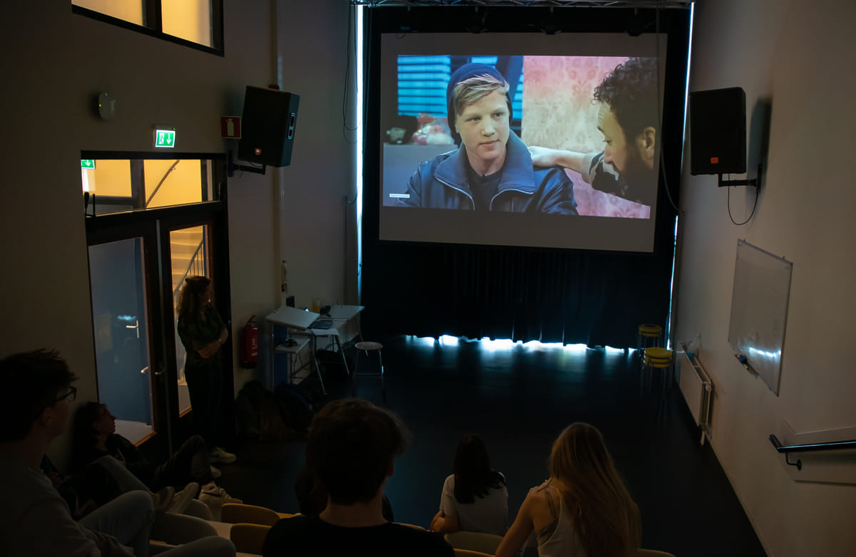 De leerlingen komen het lokaal binnen en lopen doelbewust naar de achterste rijen. “Komen jullie op de voorste rijen zitten,” vraagt Roos. Met enige twijfel staan ze op en komen ze dichterbij, hun gezichtsuitdrukkingen neutraal als ze naar het scherm turen. Onderling worden op zachte toon gesprekken gevoerd.