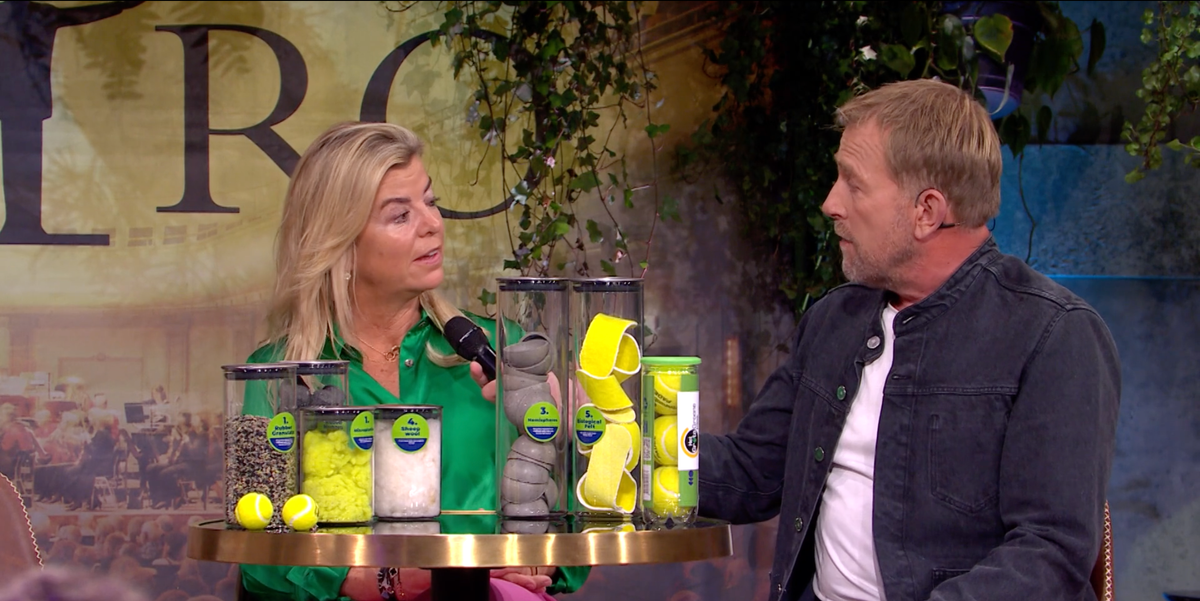 Tennis- en padelballen gemaakt van oude ballen. We gebruiken er jaarlijks zo'n 350 miljoen en ze zijn heel slecht voor het milieu: in de neongroene stof zit veel microplastic. Daarom wordt er bij de gerecyclde versie een biologisch vilt omheen gedaan.
