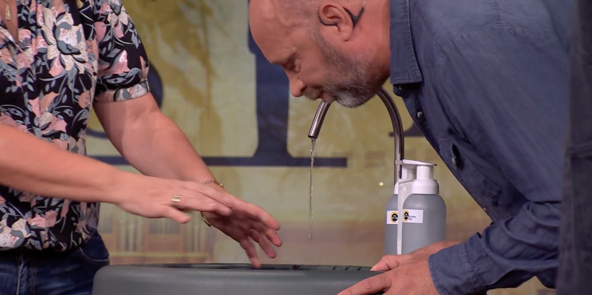 Een regentap gemaakt van gerecycled plastic. Het bevat een wasbak, kraan en voetpomp. Gebruik regenwater in je tuin of op openbare plekken met deze regenton, en ga zo verspilling van water tegen.