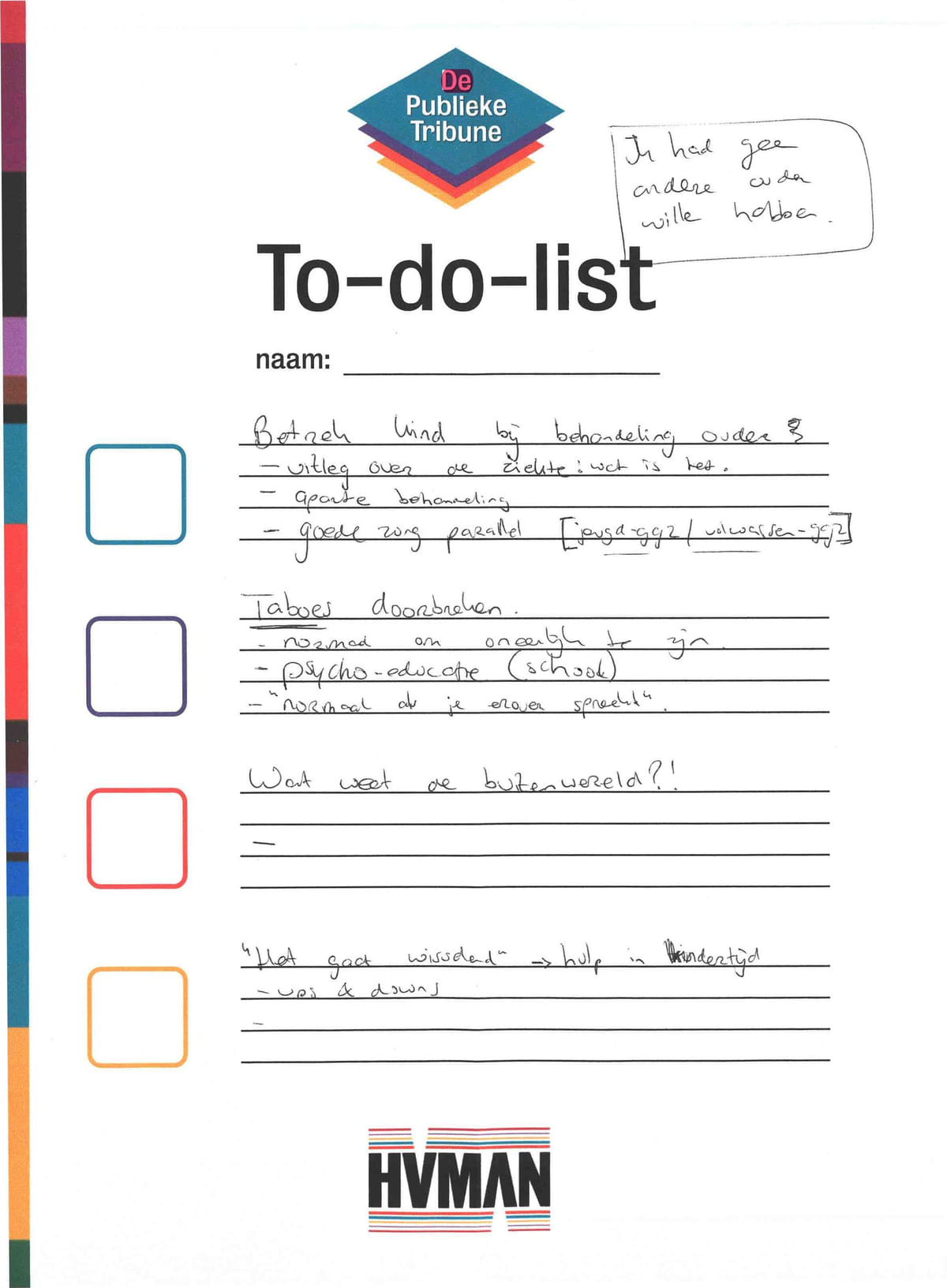 Meer dan een half miljoen kinderen in Nederland groeien op met een ouder met psychische problemen of verslaving. Wat hebben deze kinderen nodig in hun zorgen voor en om een naaste? Op deze to-do-list schreef staatssecretaris Van Ooijen tijdens het gesprek op wat hem de komende tijd te doen staat.