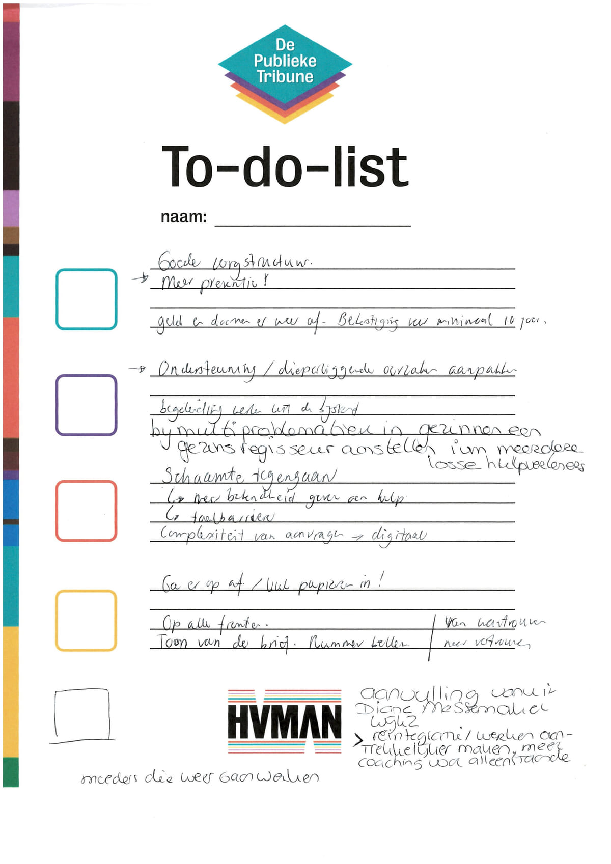 Wat gaat zij aan hun situatie veranderen? Op deze to-do-list schreef zij tijdens het gesprek op wat haar de komende tijd te doen staat.