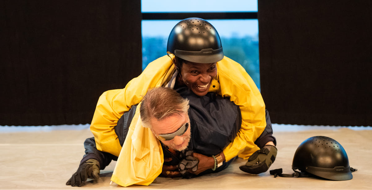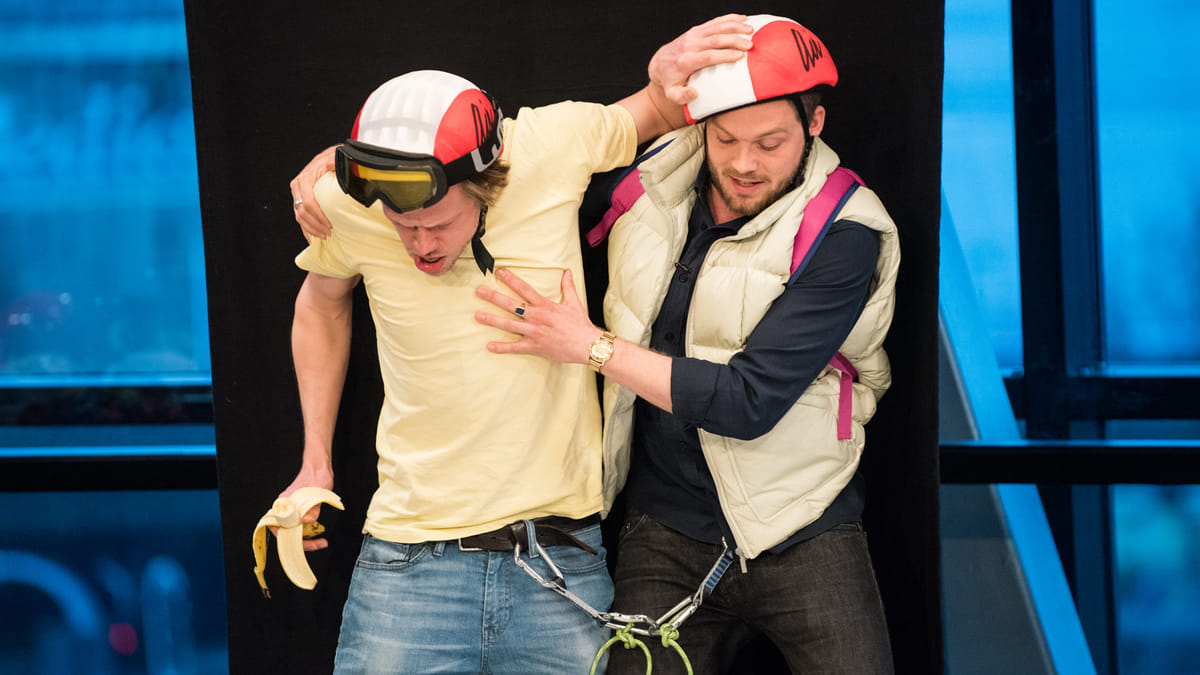 “Twee mannen (Sanne den Hartogh en Teun Luijkx) doen een leiderschap- straining en moeten daarvoor een berg beklimmen. Een van de twee heeft hoogtevrees, maar durft dat niet te zeggen, want dan ben je een watje, geen leider. Je kunt ontkennen wat je wil, maar eenmaal op zo’n berg word je gewoon schijtebang. Deze scène heeft ook weer te maken met wie je wil zijn en wie je in werkelijkheid bent. De acteurs zijn samen heel geestig. Daar let ik ook op bij het casten van de spelers.”