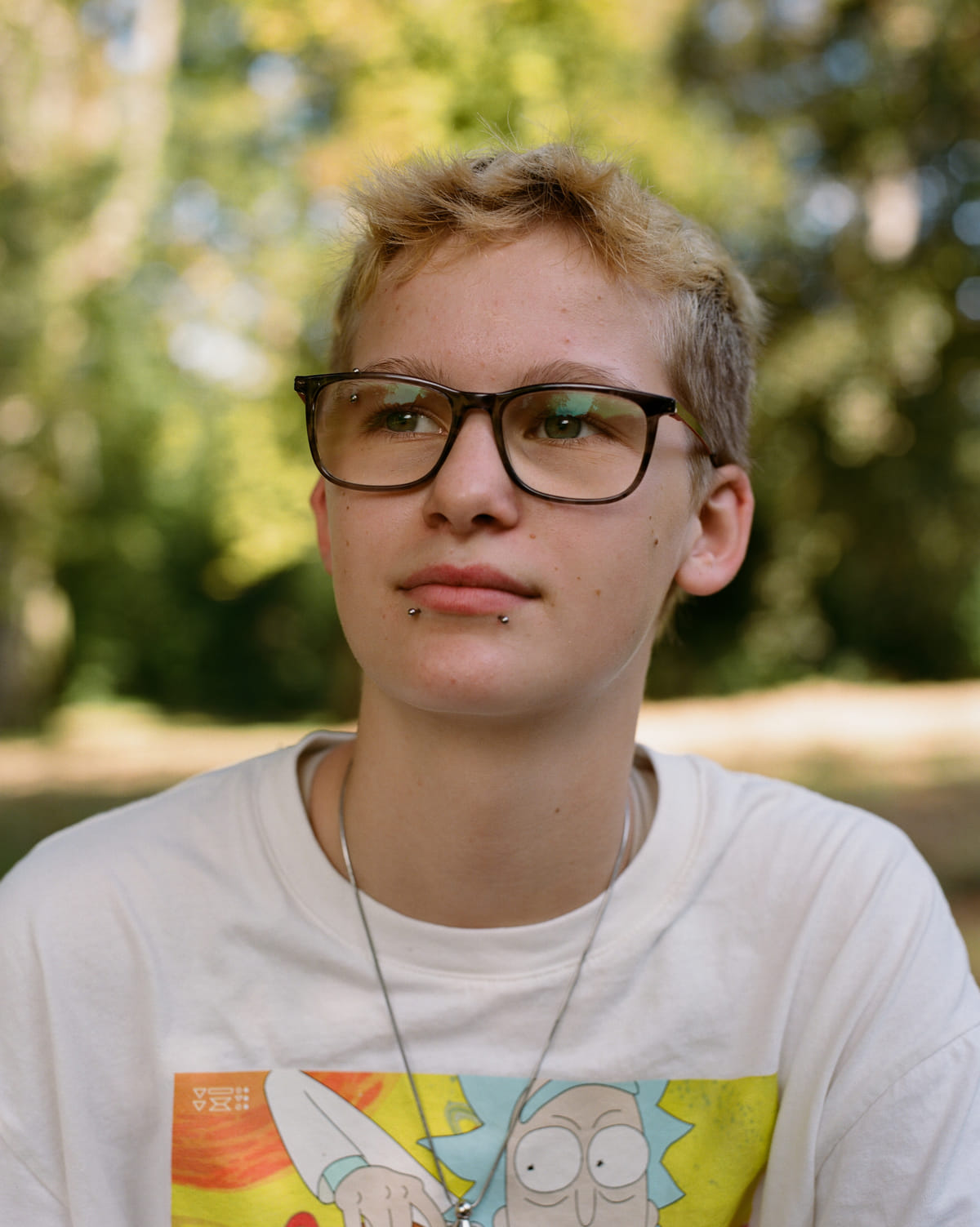 Eliott stuurde een jaar geleden zijn ouders een appje om te vertellen dat hij met testoteronbehandeling wilde beginnen. Hij wist zeker dat dit was wat hij wilde, maar zag tegen de confrontatie op. “Ik dacht, ik stuur het als ik niet thuis ben, want dan kunnen zij er ook een beetje aan wennen”. Eerst hadden zijn ouders wel zorgen en waren ze bang dat het te snel ging, dat hij het te snel had besloten. Maar inmiddels staan ze volledig achter hem. Hoewel zijn ouders hem steunen, zijn de wachtlijsten voor transzorg in Nederland lang. Gelukkig konden ze via Engeland zorg regelen. Nu gebruikt Eliott al een tijdje testosteron, met hulp van de huisarts in Nederland. Eliott houdt van tekenen, fotografie en muziek maken. ‘‘Muziek is voor mij echt de manier om mijn emoties eruit te laten’’, zegt hij.