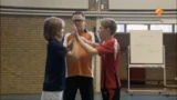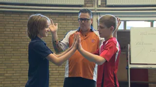 “OK… Zoek een maatje op, ga niet te ver uit elkaar staan en zet de handen tegen elkaar. Zag je wat er gebeurde? Pats! Nu rustig met de handen tegen elkaar. En van hieruit ga je iets doen en niet persé meteen hard. Want als de één Rots inzet dan gebruikt de ander Water. Beter, beter, dat was heel mooi: dat was water.”