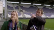 Filip Boen leidt Stine Jensen door het stadion van Beerschot.