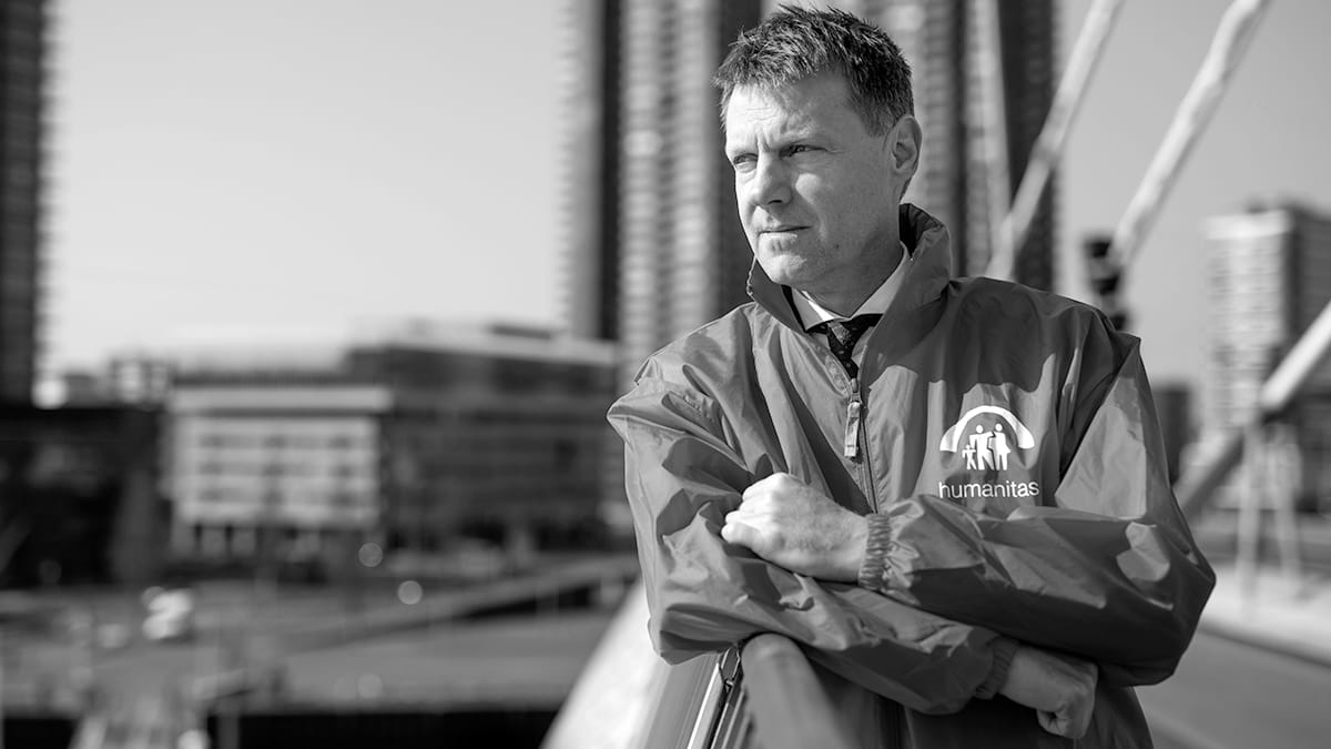 ‘Ik heb anders wel een stropdas om en een pak aan,’ reageert Van Herk. ‘Maar dat had met iets anders te maken vandaag.’ Hij komt zijn kantoor binnengelopen na een presentatie bij World Press Photo in de Rotterdamse Laurenskerk. 32 portretten van Humanitas-patiënten prijken daar op grote borden. ‘Als je mensen van 7 tot 107 helpt, dan zijn dit de verhalen. Ik wil een statement maken: laat de zorg alsjeblieft over mensen gaan.’