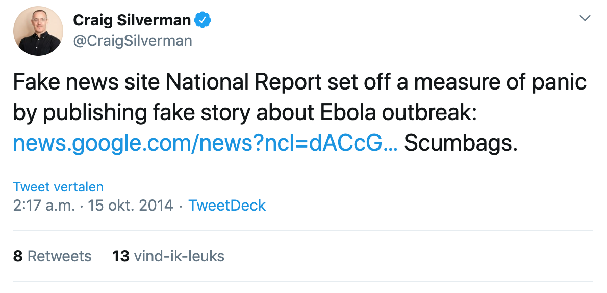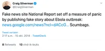 De tweet gaat over een zogenaamde ebola-uitbraak bij een familie in Texas. “In een tijd vol angst voor een virusuitbraak, verspreidden ze het nepnieuws dat deze familie in quarantaine was gezet. Daarmee zijn ze wat mij betreft te ver gegaan. Mensen waren bang en bezorgd. Lokale nieuwsorganisaties moesten als gevolg mensen waarschuwen dat het verhaal niet klopte. Het is paniek zaaien om niks. En voor advertenties en geld.”