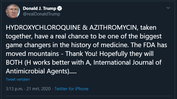 Het wetenschappelijk debat blijft voorlopig woeden, maar inmiddels neemt ook de Franse president Emmanuel Macron het medicijn in overweging en geloven veel Amerikanen in de werking ervan. Foutief gebruik is nochtans niet zonder gevaar. Raoult zelf geeft toe dat zijn onderzoek misschien niet helemaal waterdicht is, maar roept – net als Bert Blocken – dat vooral handelingssnelheid op dit moment van belang is. Het roept vragen op over de crisisstandaarden en belangen bij de publicatie van wetenschappelijk onderzoek.