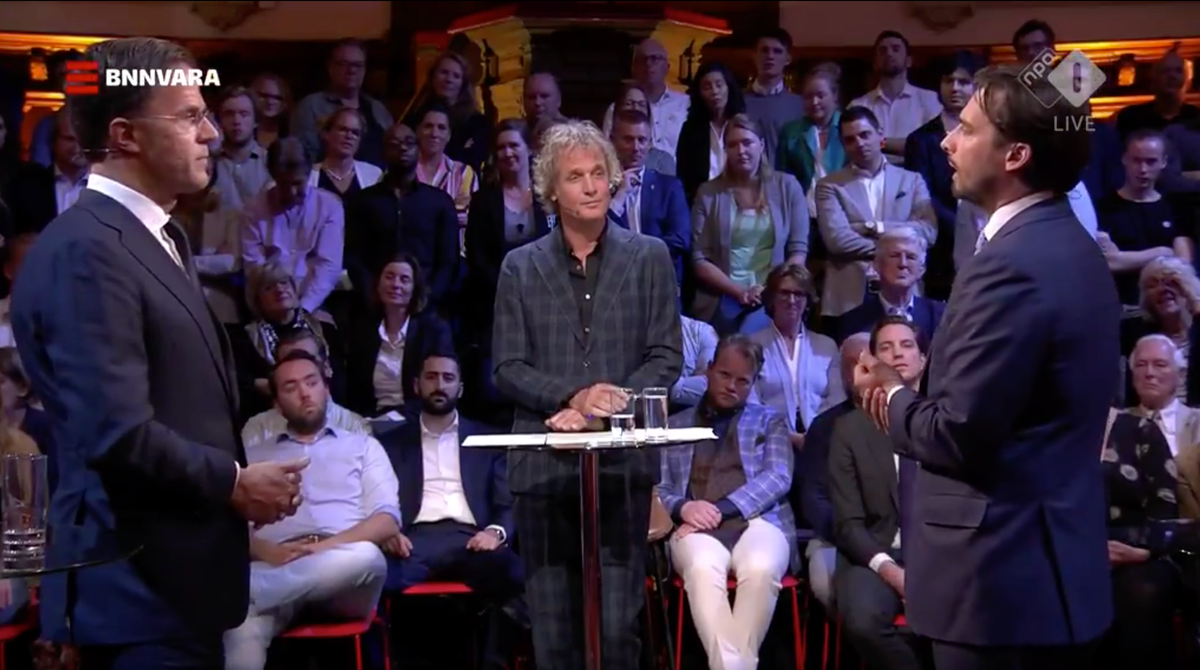 Burger zit die avond voor de televisie: ‘Ik was zeer verbaasd dat het filmpje integraal werd uitgezonden, dat had ik als redacteur nooit gedaan. Maar ik dacht, nu gaan ze natuurlijk verwijzen naar ons stuk, dat we vanmiddag hebben gepubliceerd. Maar het kwam niet, noch van Pauw, noch van Mark Rutte.’ Over de lengte van het getoonde spotje in de debatuitzending is eindredacteur Meijer kort: ‘Volgens mij was het geen twee minuten en hebben we er wel in gemonteerd. Maar dat vind ik niet zo belangrijk. We hebben de lengte van het ene filmpje afgestemd op de ander, zodat we twee even lange instarts zouden hebben.’ Het klopt inderdaad dat de instart in het debat korter is, nog geen minuut. Over het niet benoemen van de oorsprong van het spotje is Meijer kort: ‘Ik vind eerlijk gezegd de achtergrond van het filmpje niet zo relevant. In ieder geval minder relevant dan de doorlinking daarvan door Baudet, en dat hij het online heeft gebruikt voor zijn campagne.’