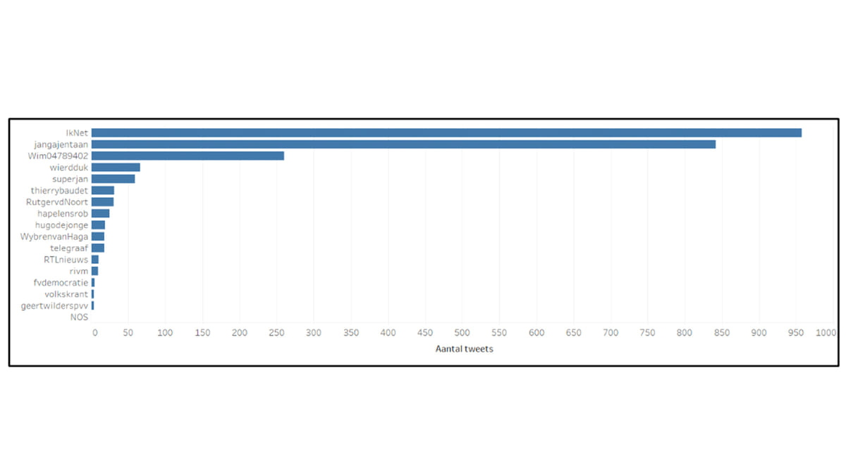 Opmerkelijk is dat sommigen van deze extreem actieve gebruikers in de belangstelling blijven staan. In eerdere vergelijkbare onderzoeken van de Utrecht Data School verdwijnen dit soort accounts namelijk juist naar de randen van de discussie op Twitter. ‘Je kunt zo’n actief account vergelijken met iemand die vroeger op een dorpsplein stond te schreeuwen,’ zegt Bakker. ‘Als iemand zo staat te schreeuwen, zijn mensen vaak niet meer bereid om naar die persoon te luisteren. Ik kan me voorstellen dat mensen meestal niet zitten te wachten op iemand die zo actief aan het tweeten is.’ Dit kan een reden zijn waarom extreem actieve accounts vaak klein blijven.