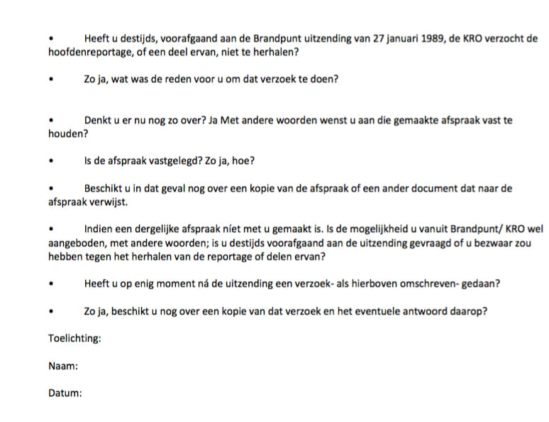 De KRO-NCRV weigert de beelden vrij te geven van een Brandpunt-reportage uit 1989.