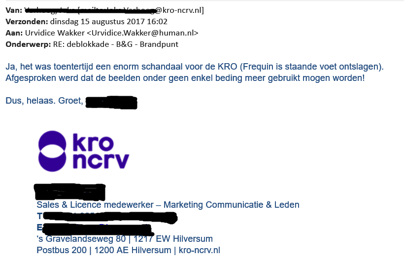 Op basis van deze bevindingen wendt Human zich opnieuw tot hoofdredacteur Hans Laroes. Die verwijst naar de Juridische afdeling van de KRO-NCRV. Een medewerker van die afdeling laat weten dat de KRO-NCRV blijft bij zijn standpunt en geen medewerking verleent ‘aan opheffing van de blokkade’.