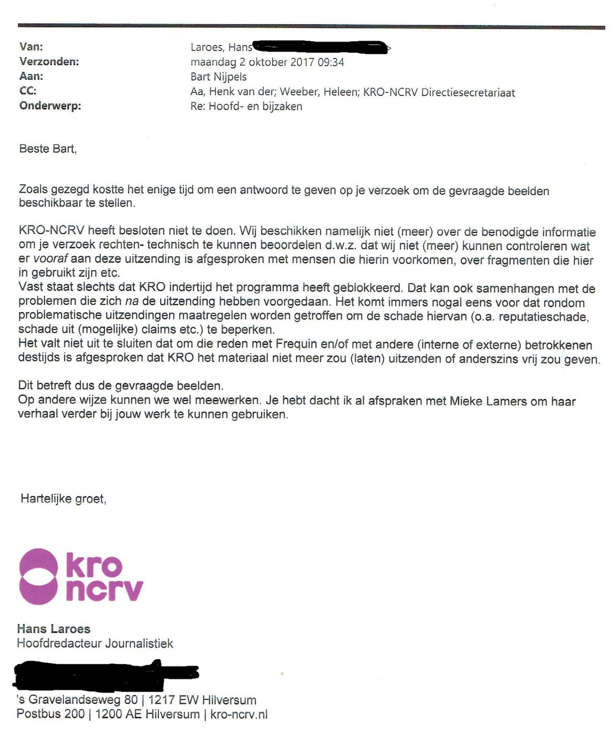 De redactie van Medialogica wendt zich op 8 september 2017 tot Brandpunt eindredacteur Henk van der Aa en Hans Laroes, hoofdredacteur KRO-NCRV opnieuw met het verzoek om het beeldmateriaal vrij te geven. Op 2 oktober antwoordt Laroes als volgt: