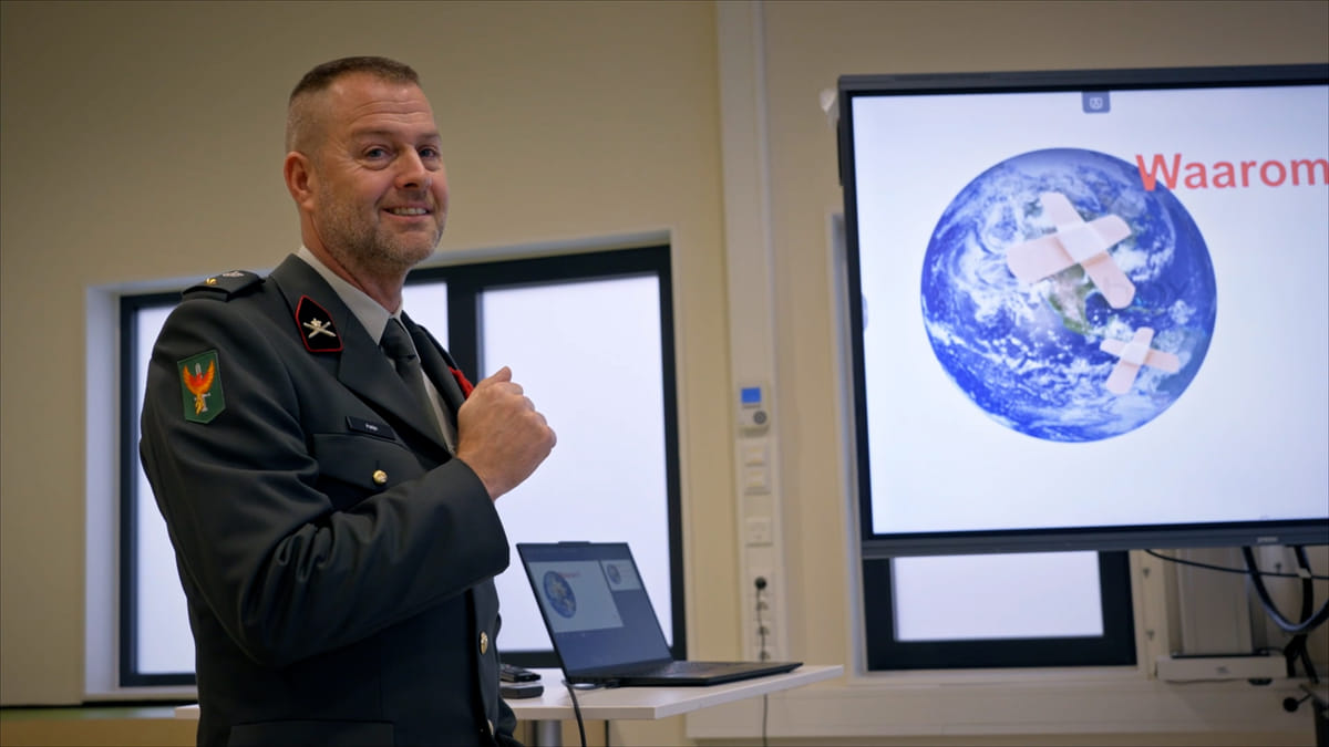 “Is dit een veteraan?” Vragend kijkt onderofficier Marc Patijn de klas in. Op het digiboard een foto van een jonge militair, die op een met bloemen versierde fiets zit. Omringd door Afghaanse kinderen kijkt hij de camera in. Het is maandagochtend, kwart over negen. Patijn is net begonnen met een gastles aan het Assink lyceum in Neede. De aanwezige VMBO-leerlingen volgen het vak ‘geüniformeerde dienstverlening en veiligheid’ en nemen het beeld van de lachende soldaat in zich op.