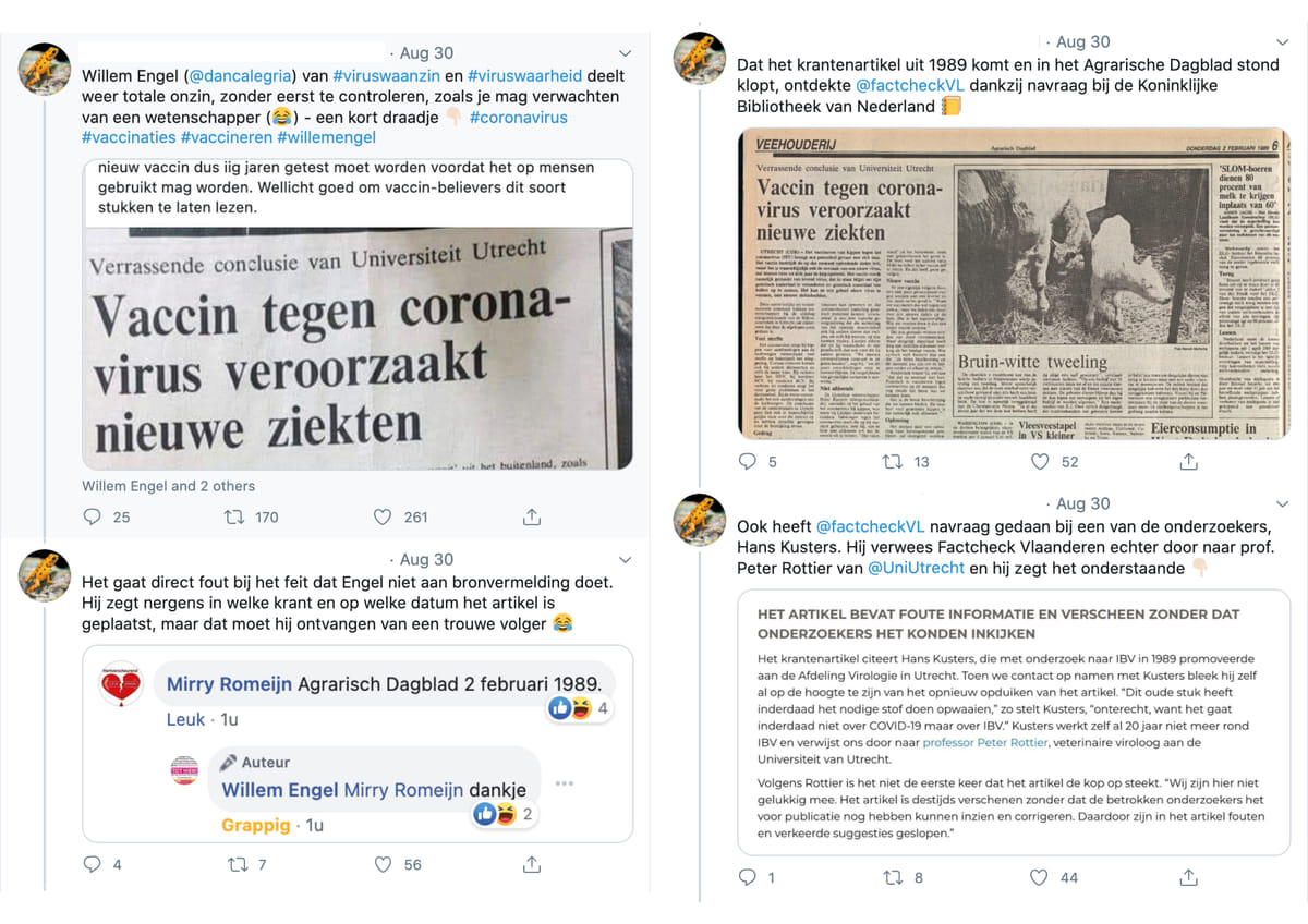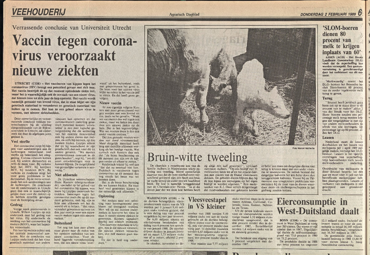 De hoofdredacteur bij factcheck.vlaanderen Ferre Wouters onderzocht de afkomst van het krantenartikel dat begin mei via sociale media opdook. Hij besloot een van de onderzoekers in het artikel te bellen. Zo kwam Wouters erachter dat het artikel uit 1989 kwam en helemaal niet over COVID-19 gaat. “Dit oude stuk heeft het nodige stof doen opwaaien,” vertelde Hans Kusters, die met het onderzoek naar Infectueuze Bronchitis Virus in 1989 promoveerde aan de Afdeling Virologie op de Universiteit van Utrecht. “Onterecht, want het gaat inderdaad niet over COVID-19 maar over IBV.” Het artikel heeft als onderwerp infectieuze bronchitis bij kippen, waarbij het vaccin door mutatie van het virus geen bescherming meer bood en moest worden aangepast.