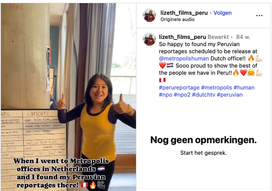 Hoewel de carrière van Lizeth inmiddels op volle toeren draait en ze voor verschillende internationale nieuwsmedia en fictiemakers werkt, is deze overstap niet altijd makkelijk geweest. “Ik kon niet echt aan de slag bij de nationale televisie, want in Peru bestaat eigenlijk geen gevestigde documentaire-industrie,” legt ze uit. “Daarom ben ik begonnen met projecten voor internationale media, achter de camera, als researcher of fixer. Dat valt goed in de smaak, want het sluit aan bij wat ik echt wil doen in het leven.”