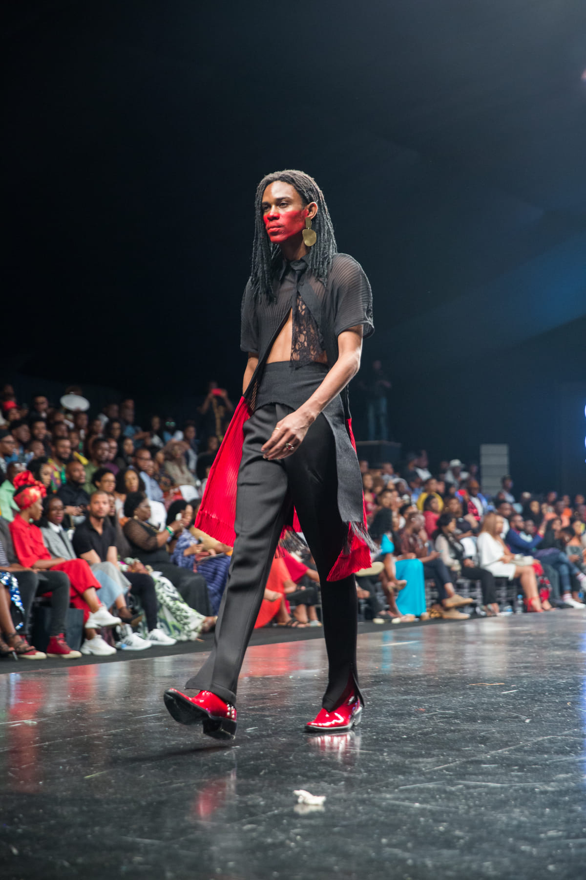 De Afrikaanse print is bovendien een importproduct: de grootste fabrikant is het Nederlandse Vlisco. Ik geloof in ambacht en word vrolijk van modeontwerpers die lokaal gemaakte stoffen gebruiken waarmee ze lokale ambacht stimuleren. En dat zien we voorbijkomen: in Nigeria gemaakte stoffen zoals Ase-oke, Adire en eigen bedrukte batiks, maar ook westerse en oosterse stoffen zoals scuba en zijde. Modellen lopen op de bekende, ongemakkelijke hoge hakken, maar ook zie ik de befaamde Crocs, sneakers, blote voeten en veel zelfontworpen sandalen voorbijkomen.