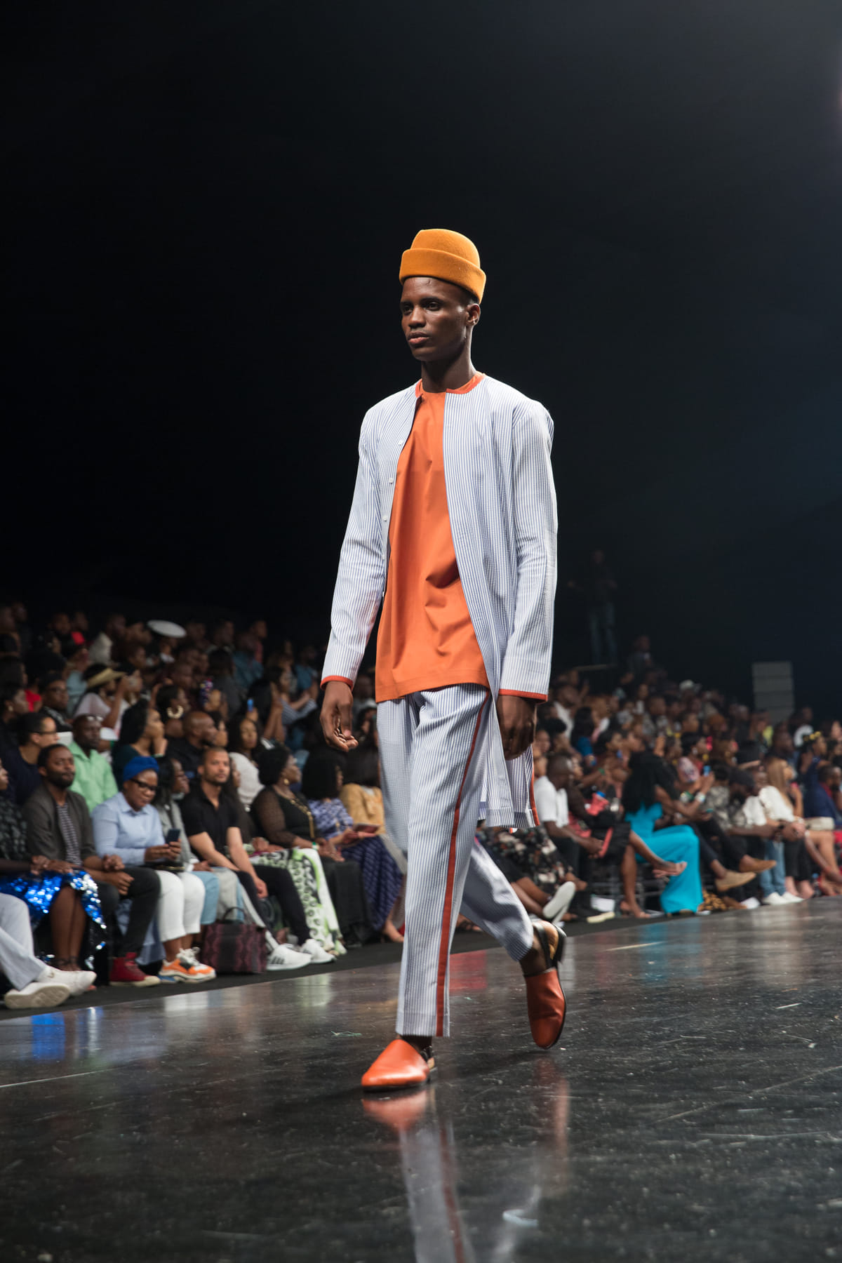 Mai Atafo is absoluut een van de publieksfavorieten. Hij laat prachtige grijze, minimalistische, bijna Scandinavisch design-achtige ontwerpen zien. De finale show is van Orange Culture. Het gebruik van veel kleur, print en teksten als ‘naked’ op de kleding, maakt zijn collectie op een onverwachte manier interessant. De gezichten van de modellen zijn rood geverfd en ze dragen kappen die lijken op de kappen uit de serie The Handmaid’s Tale.