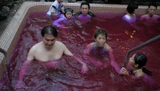 De Japanse familie Konda bezoekt een traditionele warmwaterbron met een twist. Ze komen niet voor de deugden van gemineraliseerd water, maar laten zich besproeien met koffie en wijn. "Het is gewoon leuk om je onder te dompelen in een vreemde vloeistof," aldus mevrouw Konda.