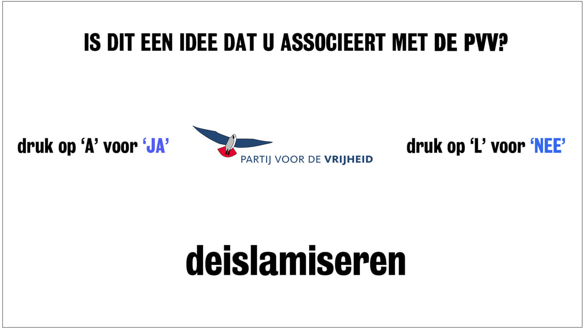 Het onderzoek werd zo uitgevoerd. In beeld verscheen het PVV-logo in combinatie met een woord, zoals 'deislamiseren' of 'racistisch'. Respondenten  moesten zo snel mogelijk aangeven of ze dat woord wel of niet bij de PVV vonden passen.