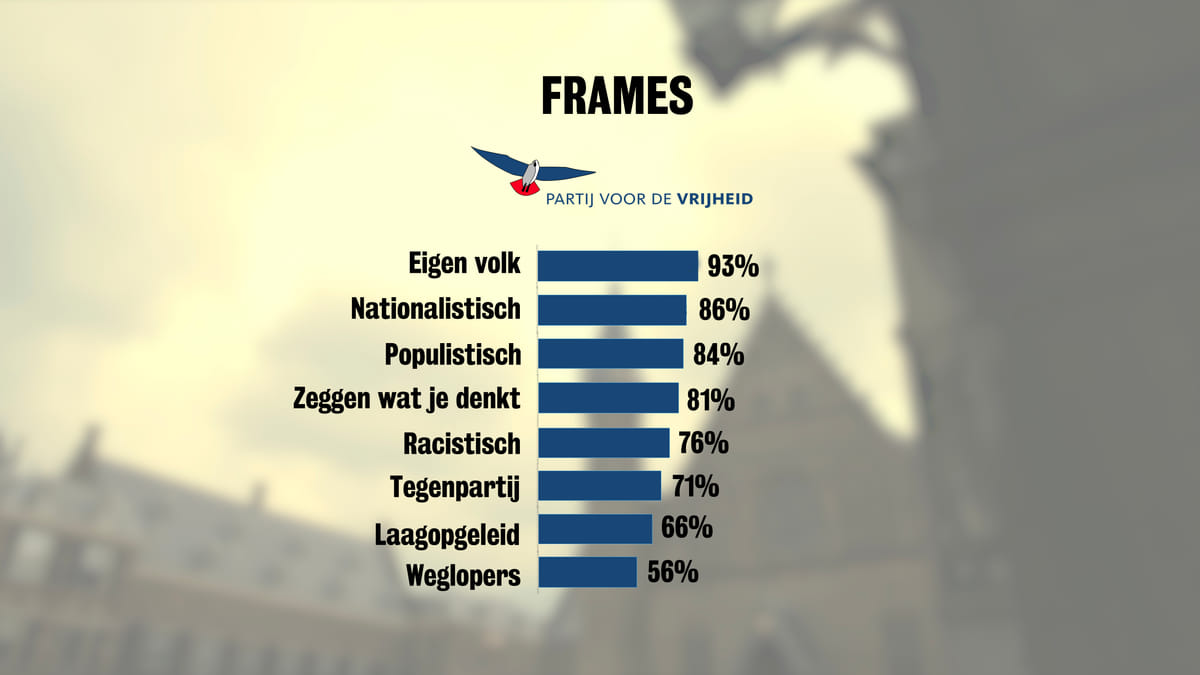 Ook de woorden 'eigen volk' en 'nationalistisch' worden vaak herkend door zowel PVV-stemmers als andere kiezers: zo rond de negentig procent van de gevallen. Deze combinatie van termen baart onderzoeker Manuel Kaal van Kantar Public zorgen. "Zet deze woorden achter elkaar en er ontstaat een gevaarlijke cocktail. Meer dan tweederde van deze kiezers vindt de PVV een nationalistische racistische partij die het eigen volk vooropstelt."