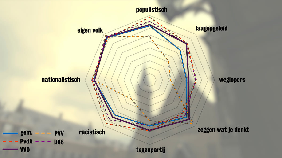 Wat opvalt is dat veertig procent van de PVV-stemmers zelf, de partij associeert met de term 'racistisch'. De associatie vormt voor deze veertig procent geen barrière om op de PVV te stemmen. Van de overige kiezers associeert een veel hoger aantal de PVV met 'racistisch'. Respectievelijk 80%, 85% en 95% van de stemmers op VVD, D66 en de PvdA.