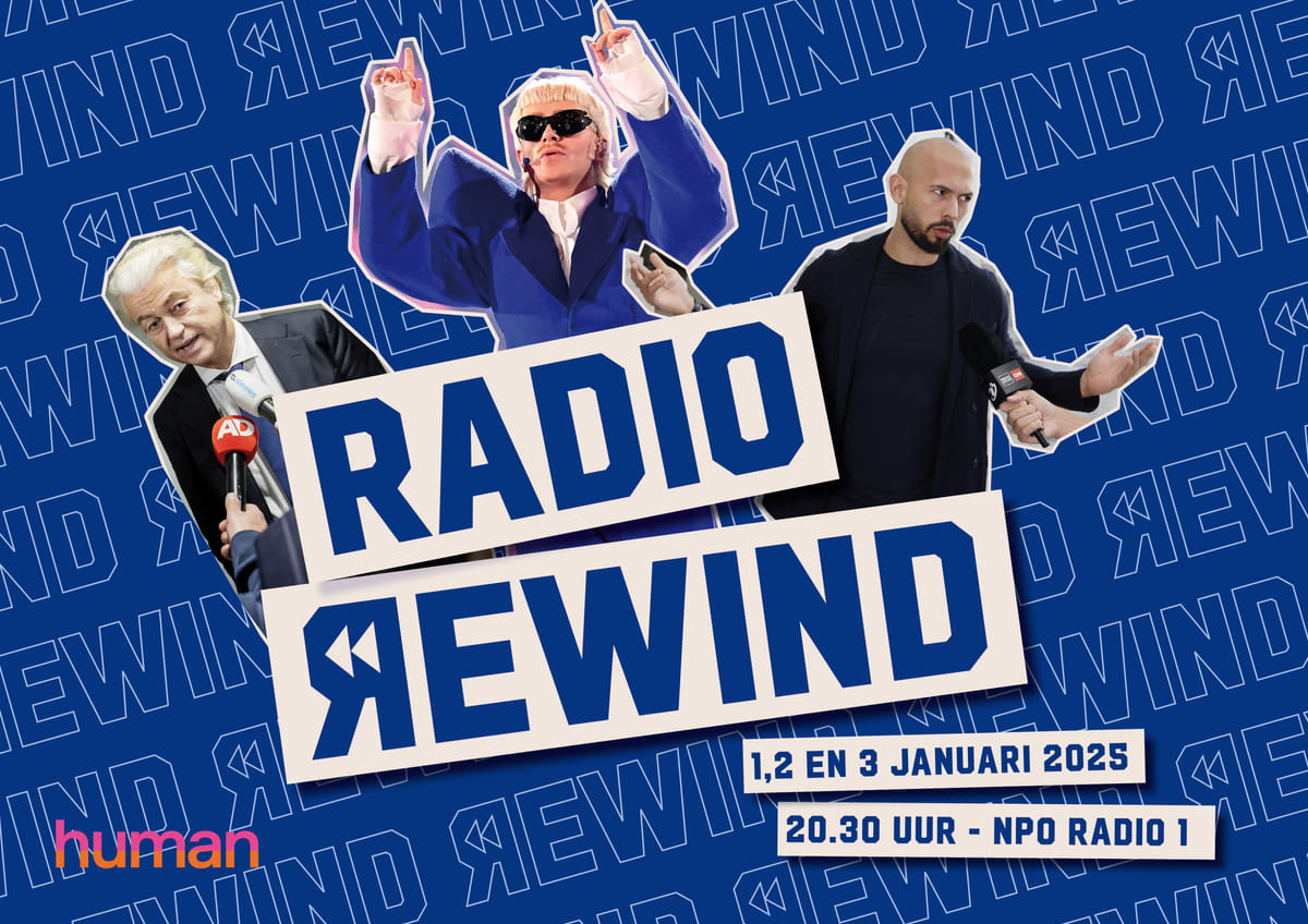 'Rewind', het nieuwe online programma van HUMAN, maakt drie live radiospecials voor NPO Radio 1. In 'Radio rewind' kijken we nog één keer terug op 2024. In deze uitzendingen richt 'Rewind' zijn blik op de beeldvorming en mediadynamiek rondom Joost Klein, Geert Wilders en radicaalrechtse influencers met presentatoren Nathan de Vries en Eva Koreman.