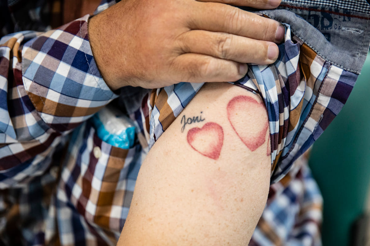 Waar Herman het meest bang voor is? "Dat ik op een dag mijn kleinkinderen niet meer zal herkennen," zegt Herman. "Ik heb meteen een tatoeage laten zetten met de namen van mijn kleinkinderen, Levi, Renske en Joni," zegt hij terwijl hij de tatoeage van drie rode harten en de namen van zijn kleinkinderen erboven op zijn linkerarm laat zien.