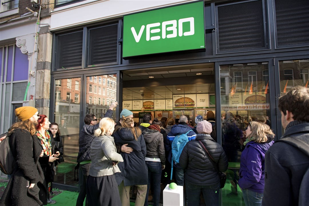 Toen wij de vegetarische grillburger lanceerden in 2018, hebben we voor een aantal dagen de FEBO Ferdinand Bolstraat helemaal omgebouwd tot een groene vegetarische VEBO. En dat was echt een succes. Daardoor zijn we ook aan het kijken om van een aantal filialen misschien vega-only te maken. Want we kunnen momenteel ruim 65 procent van ons assortiment vegetarisch aanbieden. Maar tegelijkertijd zitten we nu gemiddeld op 16 procent vegetarisch van alle snacks die we verkopen. De meerderheid is dus nog vlees.